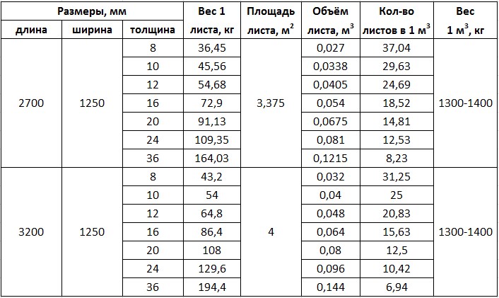 ЦСП - тяжелый материал, на 1 кв. м материала приходится около 15 кг веса. Плита выпускается одного размера, но с разной толщиной и весом.